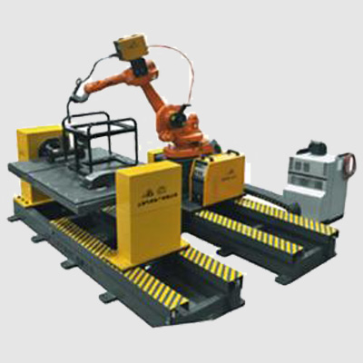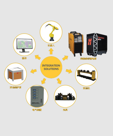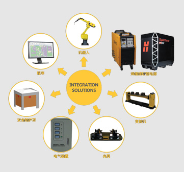 沪工机器人工作站结构主要由:机器人、焊接或切割电源、变位机、夹具、电气装置、安全防护罩等组成。